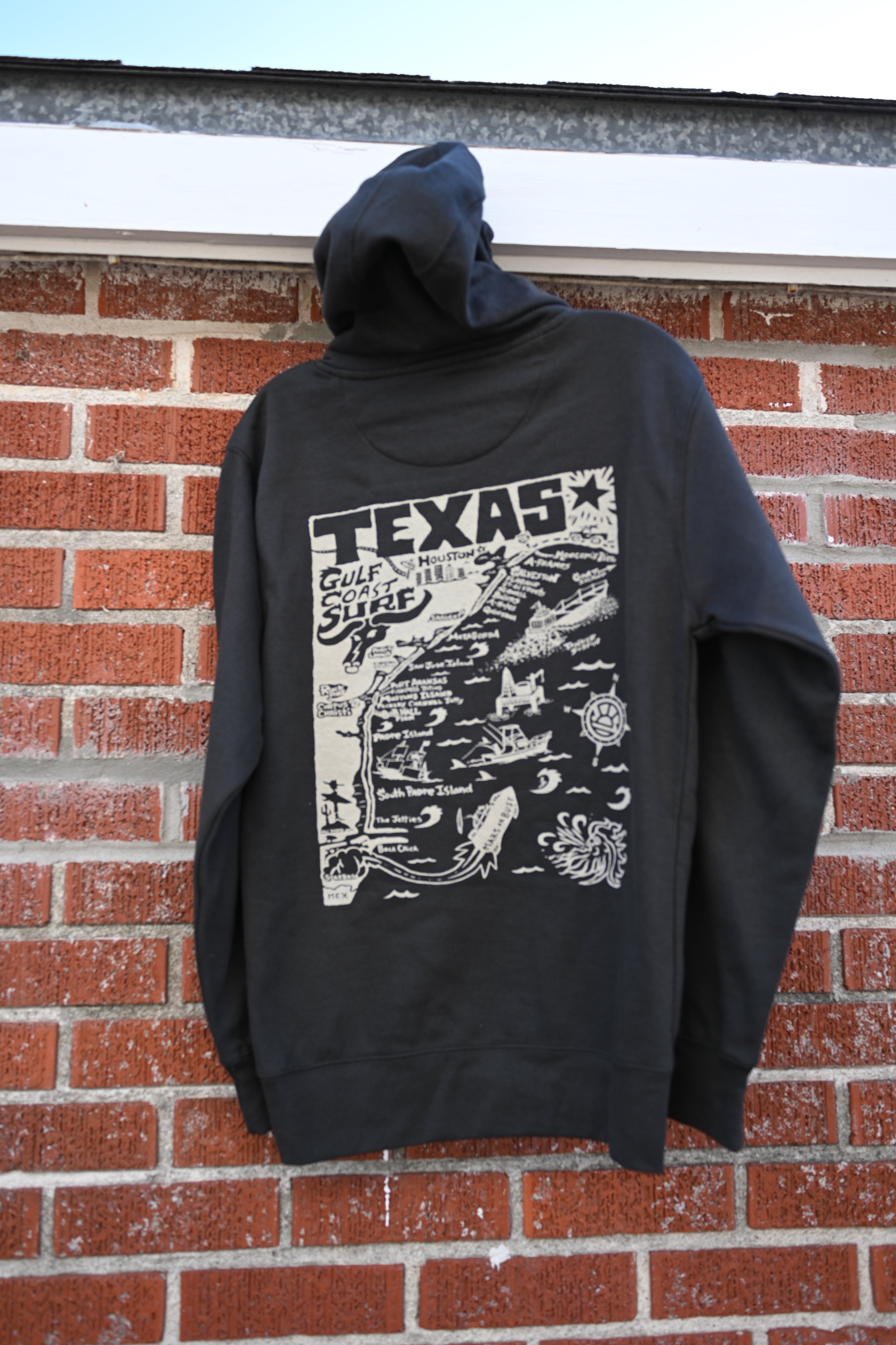 Texas is a state often overlooked in the surfing world because of our "lack" of waves. However, professional and traveling surfers alike have often ventured to our coastline for one reason or another to find a bustling and unique surf culture. This design was created to highlight the different regions along the coastline and their distinctiveness  by our good friends at Distant Local.