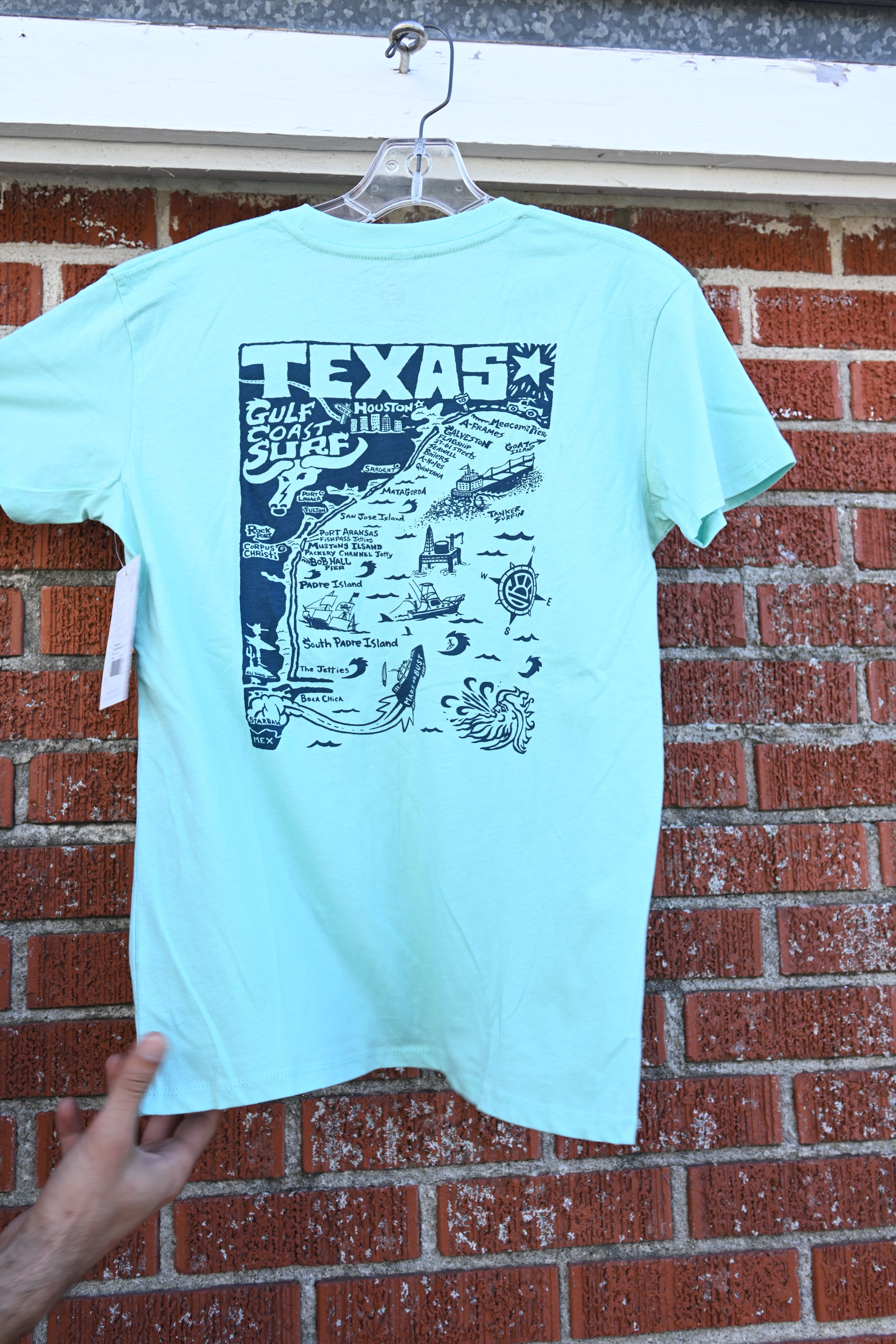 Texas is a state often overlooked in the surfing world because of our "lack" of waves. However, professional and traveling surfers alike have often ventured to our coastline for one reason or another to find a bustling and unique surf culture. This design was created to highlight the different regions along the coastline and their distinctiveness  by our good friends at Distant Local.